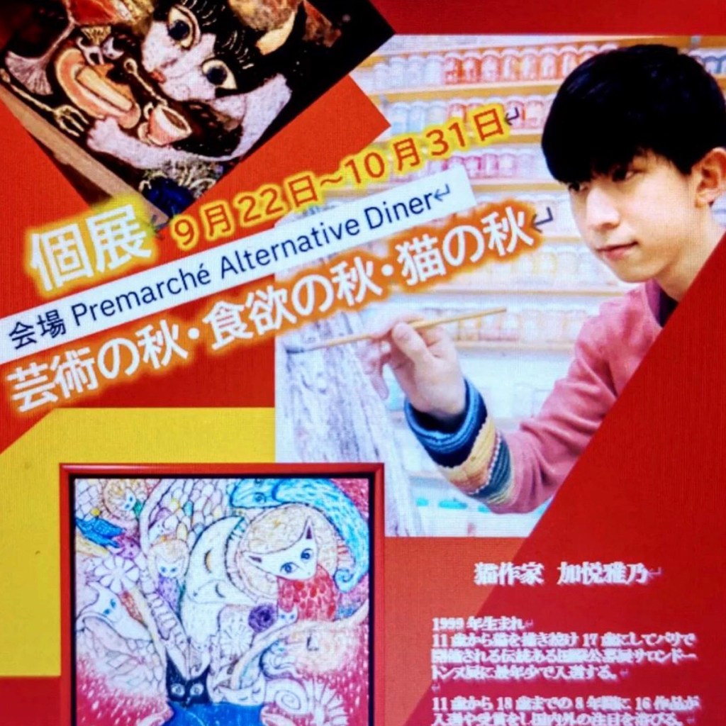 9月22日(木)から11月1日(火)まで、ダイナーで個展を開催します!! 猫作家 加悦雅乃 個展「芸術の秋・食欲の秋・猫の秋」 加悦さんの絵を見ながら、ダイナーの料理をお楽しみください! 芸術の秋 食欲の秋 猫の秋 を満喫してくださいね🐱 展示期間中のお食事のご予約も承っております お気軽にお問い合わせください☎ 加悦 雅乃(かや みやの)@miyano.99 1999年生まれ。 小学6年生(11歳)で「猫を描く作家」になると決意し、 中学卒業後は進学をせず作家活動に専念する。 11歳から20歳までの10年間に16点もの作品が入選・受賞。 17歳では伝統あるパリの国際公募展「サロン・ドートンヌ展」に初出展し最年少で入選。 大胆な構図と繊細な筆使い、独特な感性で表現した猫の絵が評価され、テレビや新聞などで脚光を浴びる。 現在、猫作家として個展等で活動中。 https://miyano99.com/ https://prema.binchoutan.com/r-natural/toku/toku_vol175.html